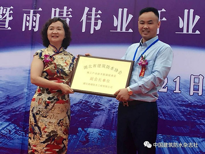 隨后,湖北防水協(xié)會會長桂春芳女士代表湖北防水協(xié)會在開業(yè)慶典大會上發(fā)表重要講話,她對湖北雨晴由最開始的施工企業(yè)轉(zhuǎn)型為防水系統(tǒng)服務(wù)商的工程進(jìn)行了簡要介紹,并對之前雨晴承接的眾多國家大型、重點(diǎn)項(xiàng)目的防水工程予以肯定,并對雨晴在湖北乃至華中地區(qū)較高知名度,美譽(yù)度,影響力予以了肯定。她還說:當(dāng)前,高質(zhì)量發(fā)展是新時(shí)代的要求,也是防水行業(yè)新時(shí)代的使命,并希望雨晴集團(tuán)在產(chǎn)品質(zhì)量、工程質(zhì)量和服務(wù)質(zhì)量的管理上進(jìn)一步做深做透做細(xì),日益精進(jìn)。心無旁騖造產(chǎn)品、一絲不茍干工程、全心全意做服務(wù),使雨晴集團(tuán)快速進(jìn)入高質(zhì)量高效益發(fā)展的康莊大道。之后授予雨晴公司“湖北省建筑防水協(xié)會施工產(chǎn)業(yè)技術(shù)聯(lián)盟促進(jìn)會副會長單位”。